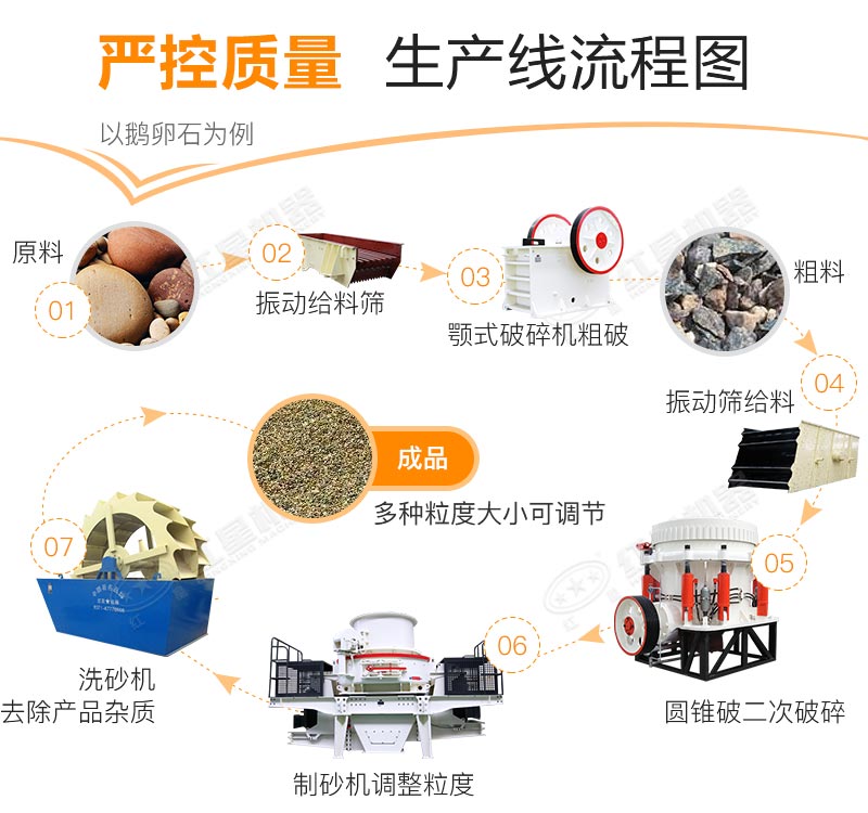 天然原石經(jīng)振動(dòng)給料機(jī)送入顎式破碎機(jī)內(nèi)進(jìn)行初步的破碎,經(jīng)過(guò)振動(dòng)篩篩選,合格部分繼續(xù)送入細(xì)碎機(jī)進(jìn)行打沙加工,對(duì)于粒度要求嚴(yán)格的生產(chǎn)線,可以接入振動(dòng)篩,多重篩分能夠進(jìn)一步優(yōu)化成料品味,細(xì)化分級(jí),成品砂料品味更好,級(jí)配更合理。